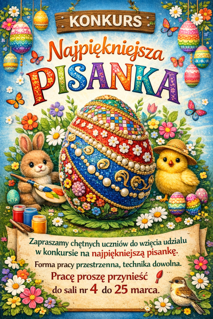 Zapraszamy chętne dzieci uczęszczające do świetlicy szkolnej do udziału w konkursie “ Najpiękniejsza pisanka”. Zadanie konkursowe polega na wykonaniu pisanki wielkanocnej w formie przestrzennej dowolną techniką.